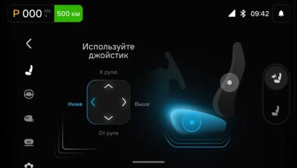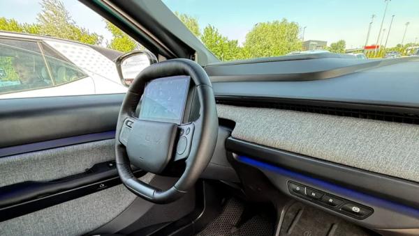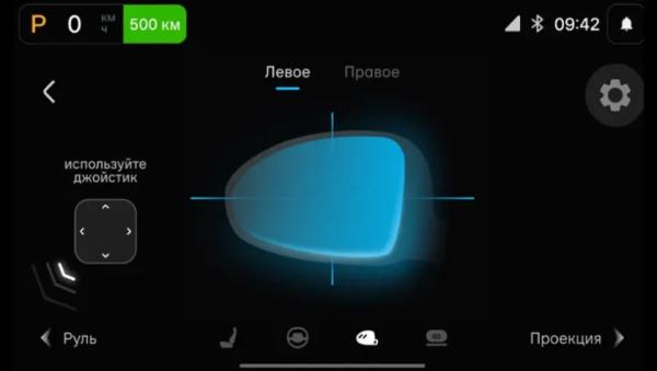 Ключевым элементом управления выступает рулевое колесо со встроенным 7-дюймовым экраном. Отдельного дисплея мультимедийной системы здесь нет: все основные функции сосредоточены именно на этом сенсорном модуле перед водителем. При этом в стандартное оснащение уже входит широкий проекционный дисплей на лобовом стекле.